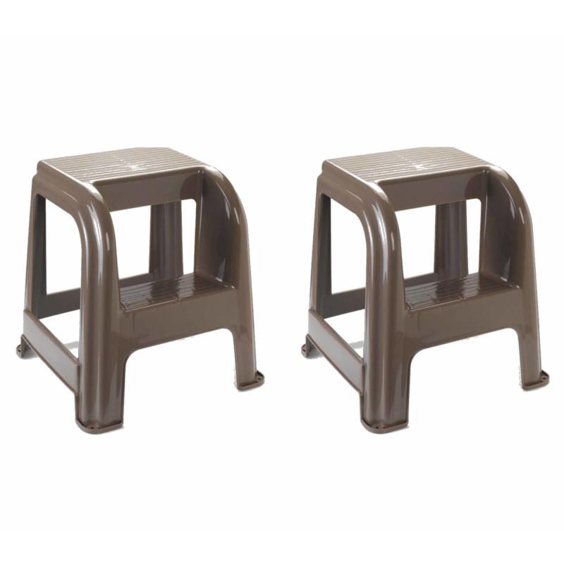 2x stuks trapje/krukje/opstapje met 2 treden in de kleur taupe bruin. Afmeting: ca. 44 x 42 x 45 cm. Materiaal: kunststof. Met antislip oppervlak. Badkamer/keuken krukje/opstapje. Aantal stuks: 1x.