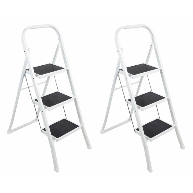 2 stuks metalen inklapbare huishoudtrap/keukentrap wit/zwart met 3 treden en anti-slip laag. Dit witte huishoudtrapje met 3 zwarte anti-slip treden en rubberen voetjes kan klein worden opgevouwen. Voorzien van een veiligheidsbeugel, zodat de trap niet zo maar dicht kan klappen terwijl u er op staat. De bovenste trede is op 71 cm van de grond. Afmeting trede: ca. 20 x 30 cm. Afmeting uitgeklapt: ca. 46,5 x 70,5 x 105,5 cm. Afmeting ingeklapt: ca. 46,5 x 4,5 x 115 cm. Max. draaggewicht: 150 kg. getest. Huishoudtrapje/keukentrapje/klustrapje voor in huis.